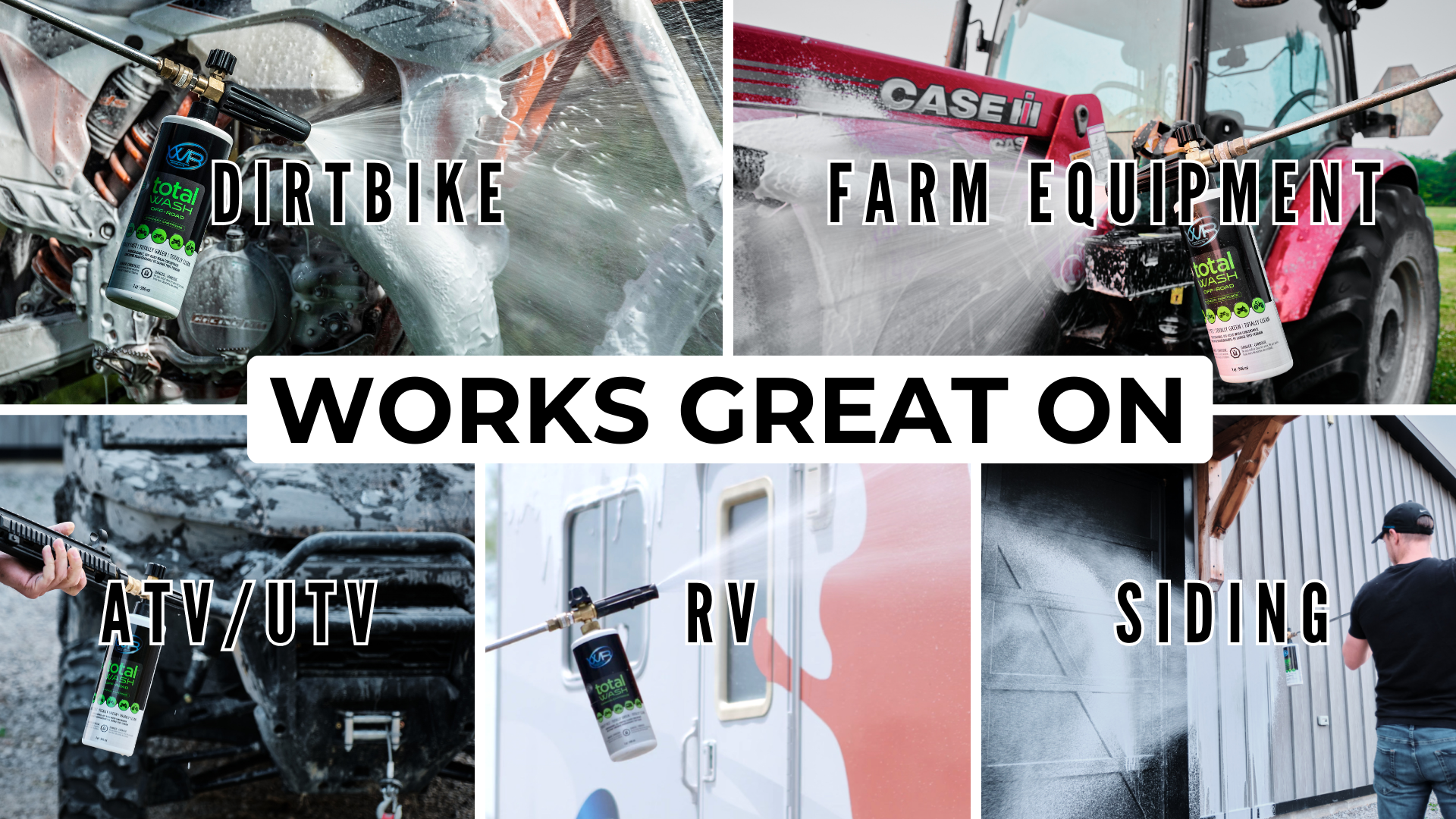 Total wash is a highly aggressive formula that is designed to cut mud and clay fast while being gentle on your rides surface!